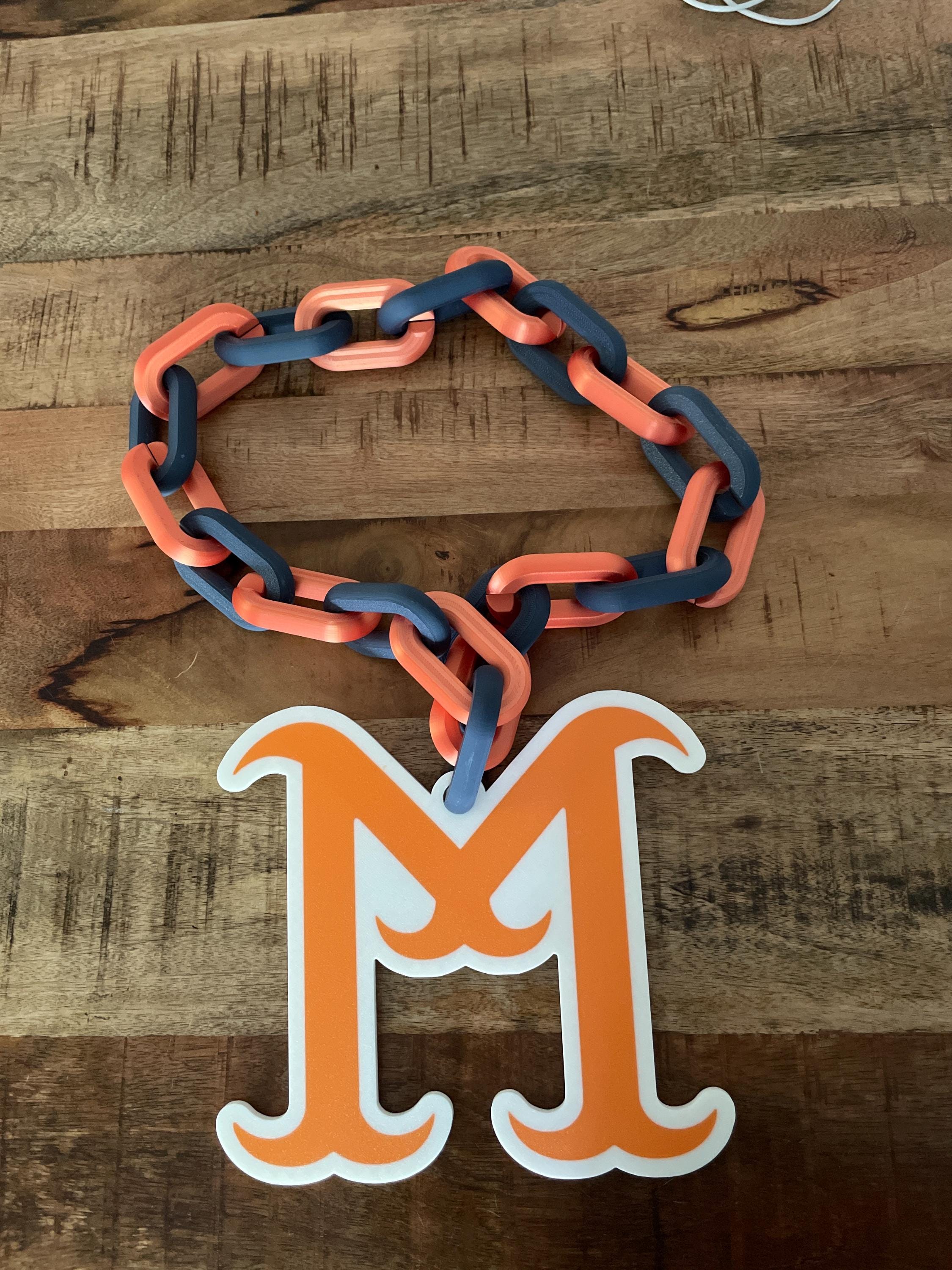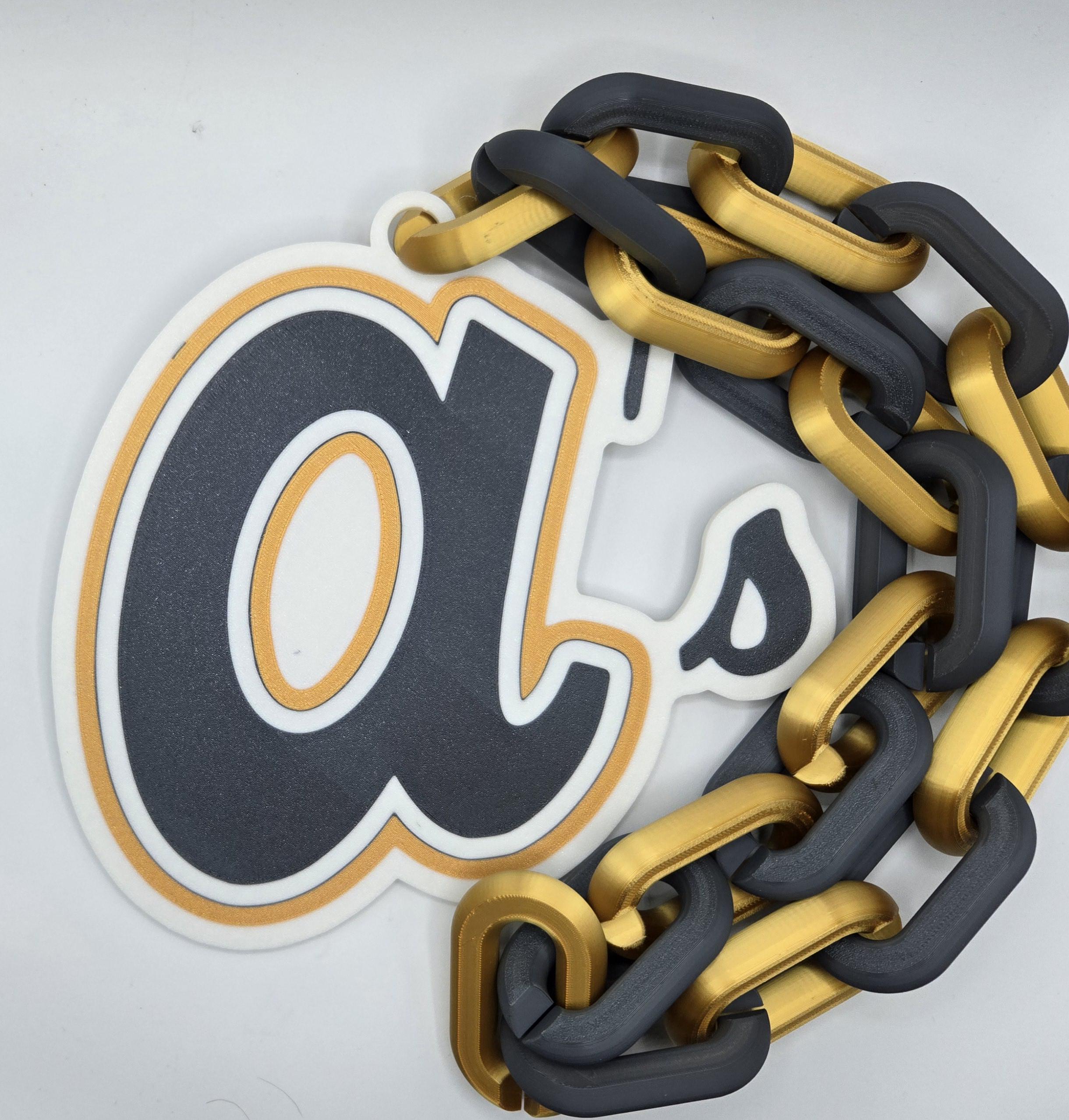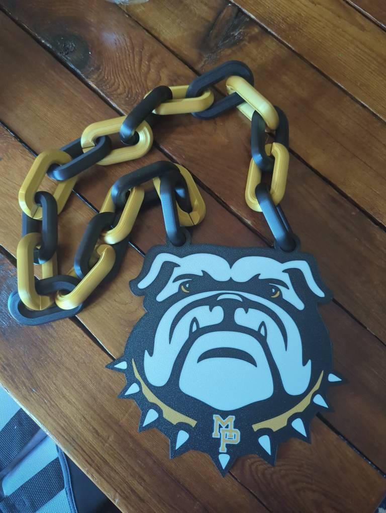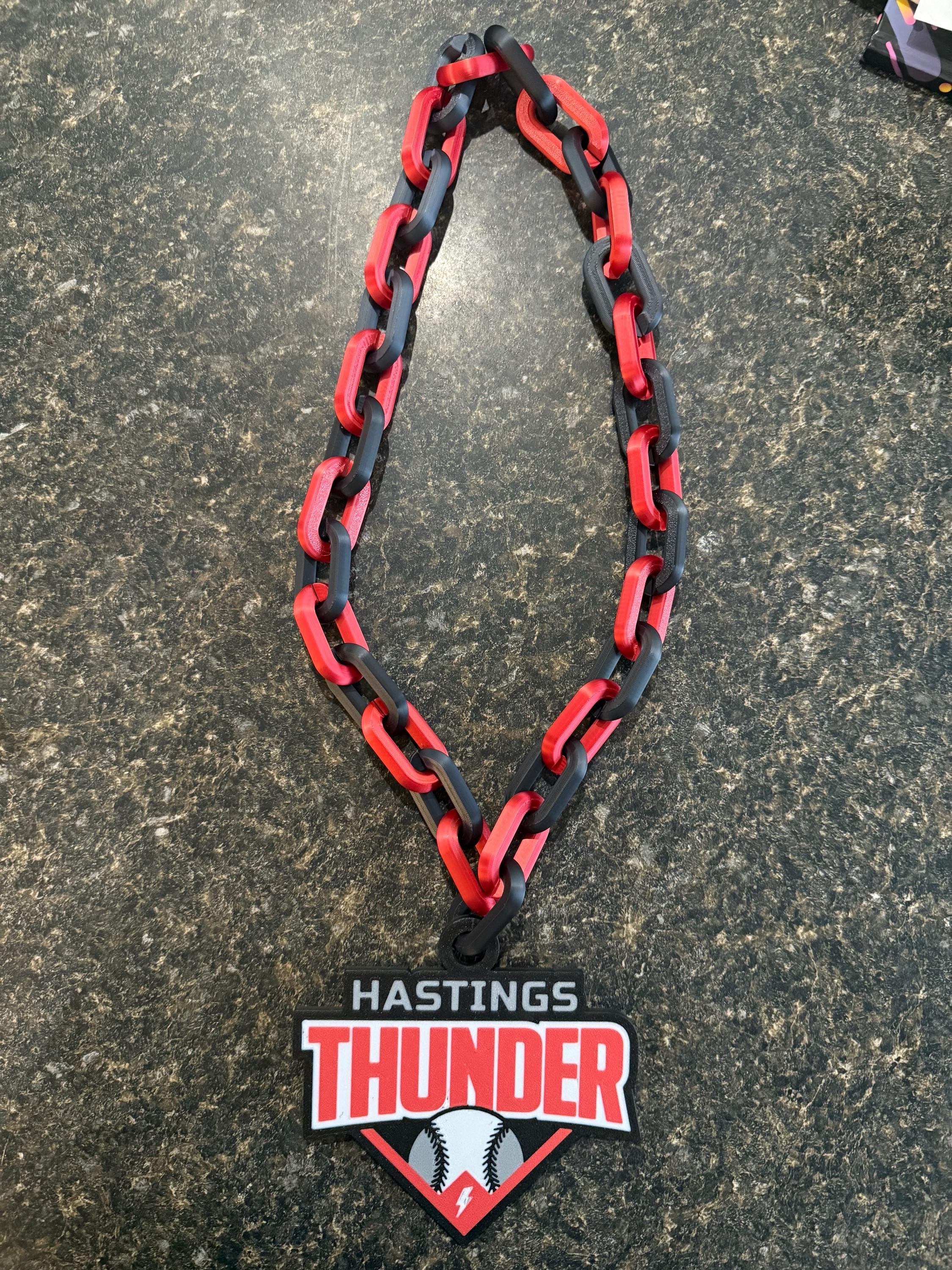 Custom Fan Chain Giant Logo Necklace, Sports Homerun Turnover Jumbo Oversized Chunky Swag Rally MVP POTG Award Baseball Football Show your team pride with a giant logo Fan Chain! You've seen them everywhere at sporting events and now you can have your own custom made Fan Chain. Just send a picture and I'll do the rest. It can be just about anything! The standard chain is black and 36" long with 2" links. Logos will about 6" at the widest or longest point. Thickness is 1/8". Material is 3D printed plastic.