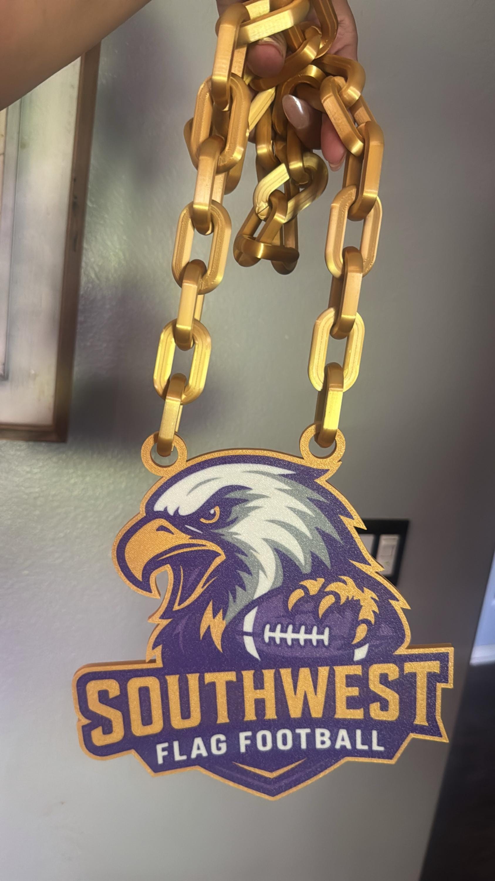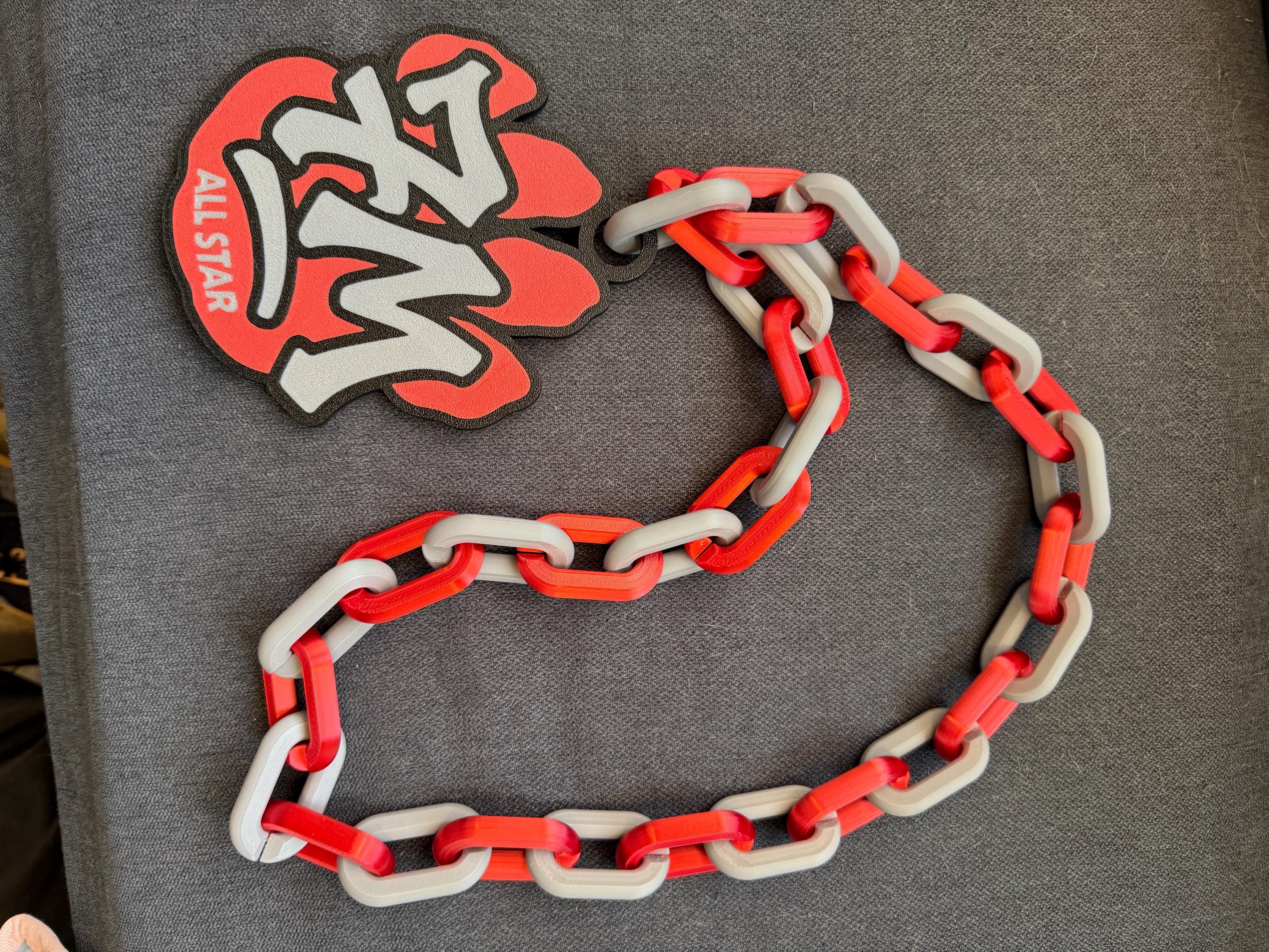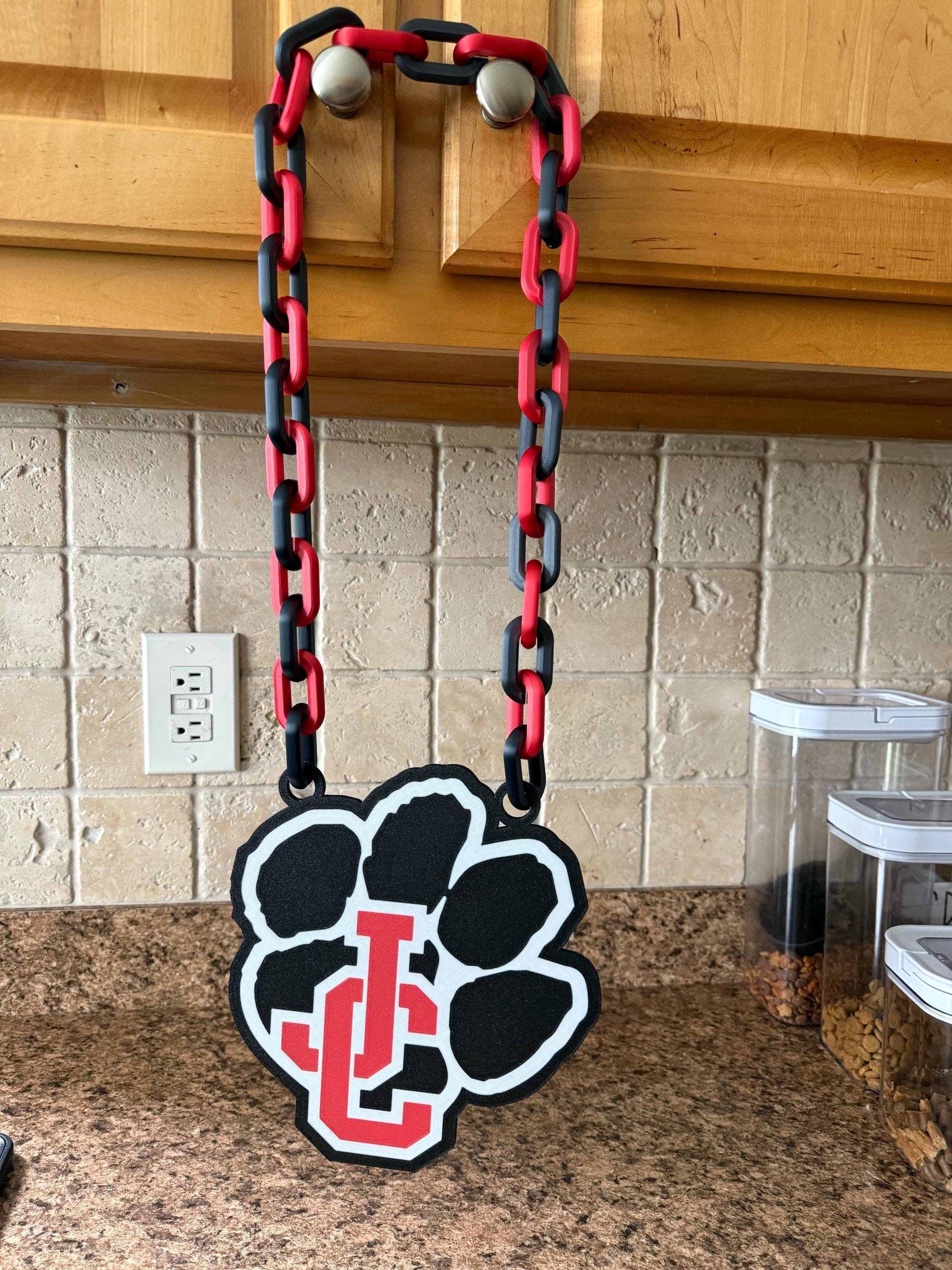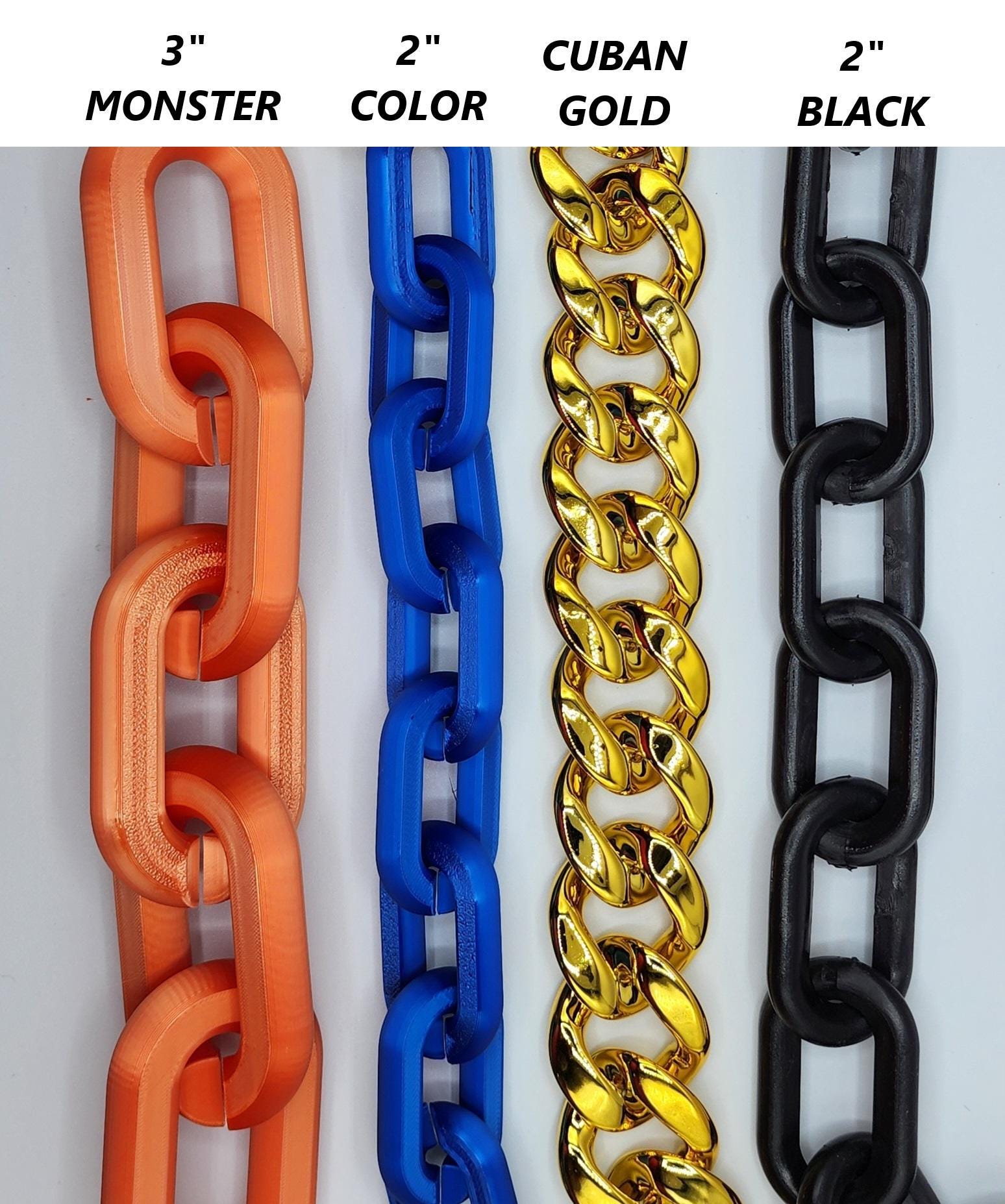 Custom Fan Chain Giant Logo Necklace, Sports Homerun Turnover Jumbo Oversized Chunky Swag Rally MVP POTG Award Baseball Football Show your team pride with a giant logo Fan Chain! You've seen them everywhere at sporting events and now you can have your own custom made Fan Chain. Just send a picture and I'll do the rest. It can be just about anything! The standard chain is black and 36" long with 2" links. Logos will about 6" at the widest or longest point. Thickness is 1/8". Material is 3D printed plastic.