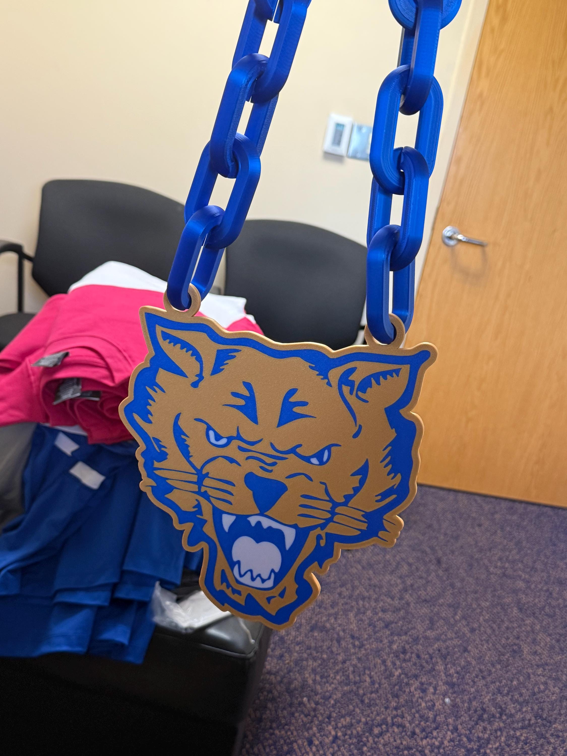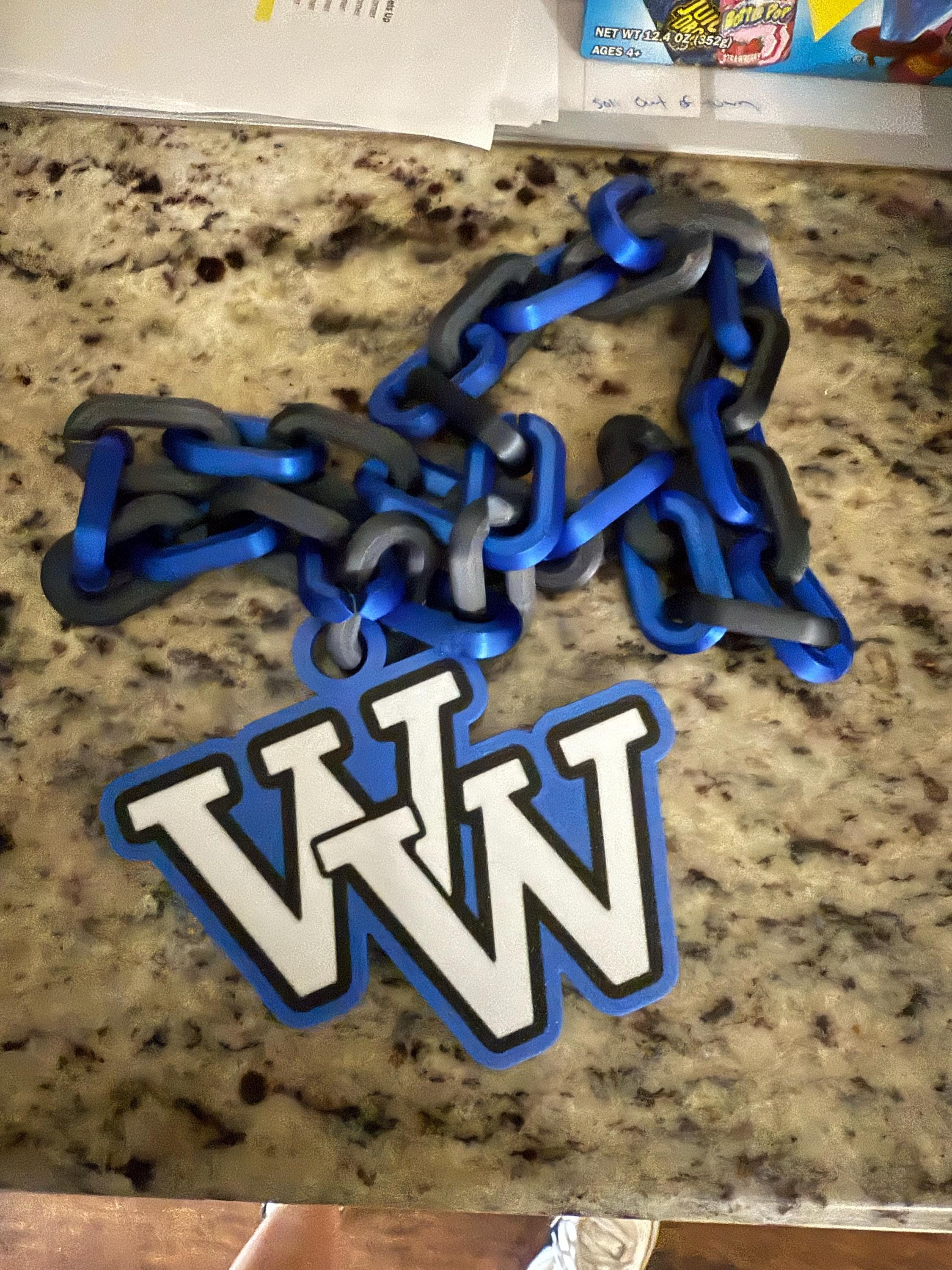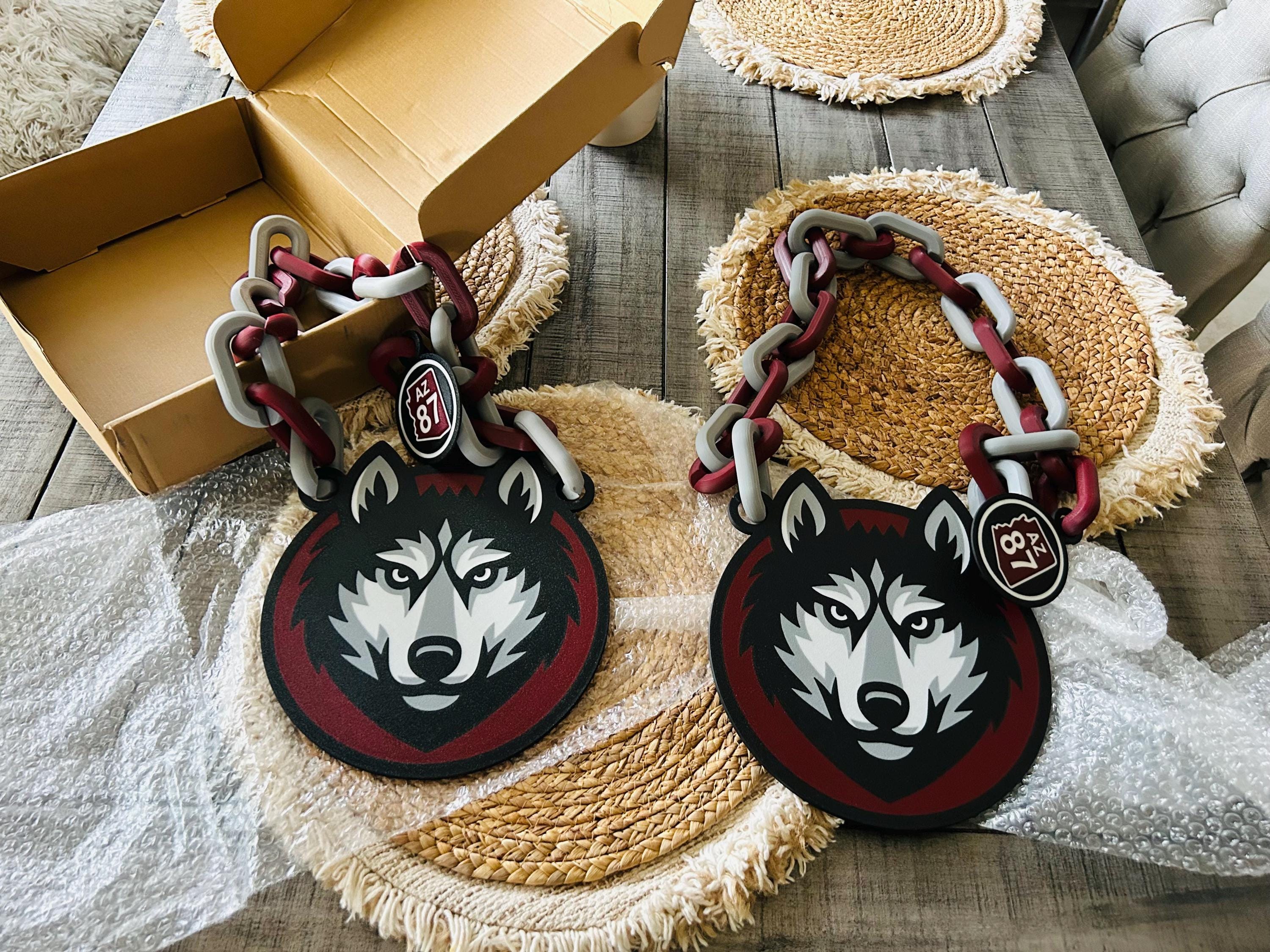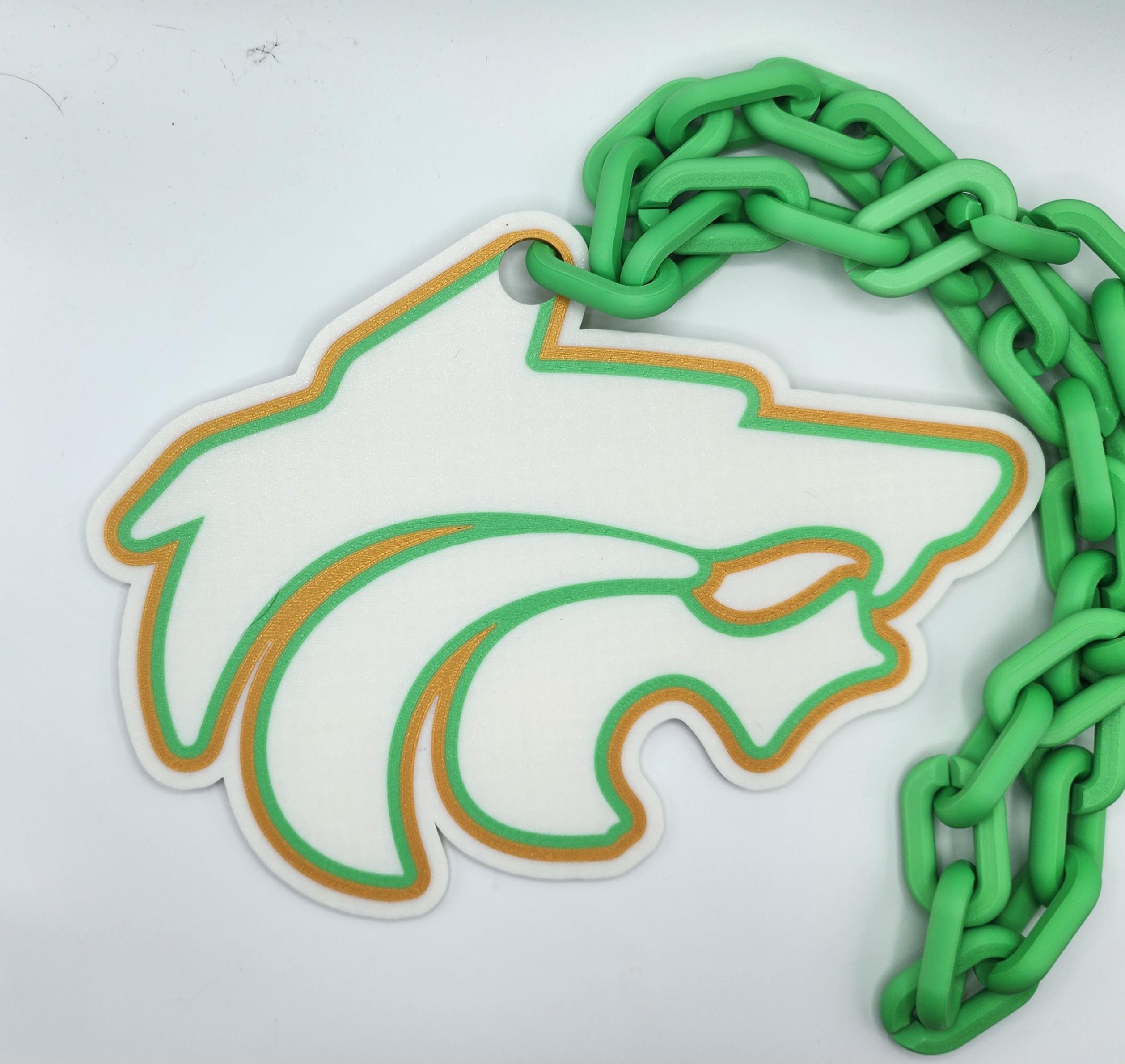 Custom Fan Chain Giant Logo Necklace, Sports Homerun Turnover Jumbo Oversized Chunky Swag Rally MVP POTG Award Baseball Football Show your team pride with a giant logo Fan Chain! You've seen them everywhere at sporting events and now you can have your own custom made Fan Chain. Just send a picture and I'll do the rest. It can be just about anything! The standard chain is black and 36" long with 2" links. Logos will about 6" at the widest or longest point. Thickness is 1/8". Material is 3D printed plastic.