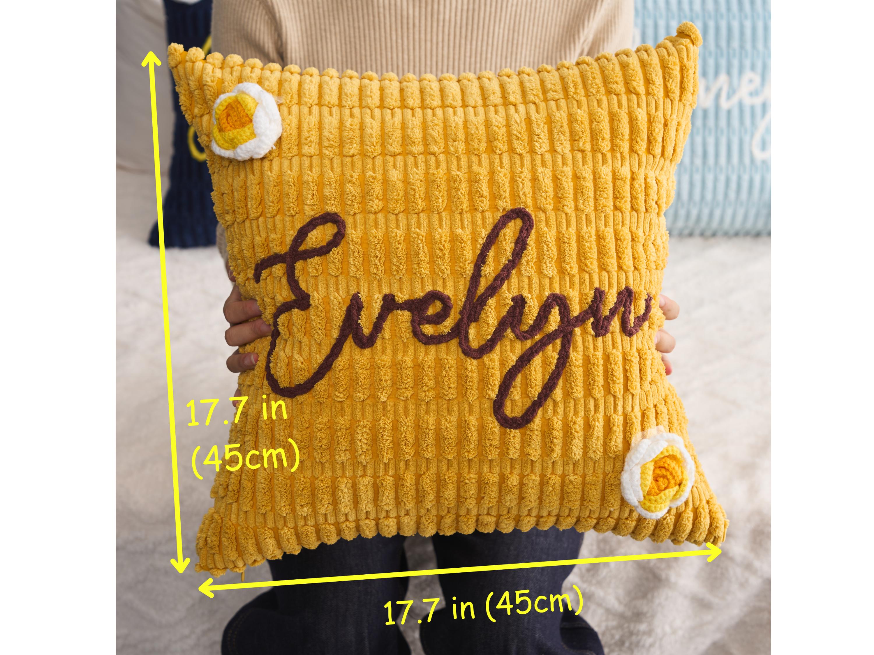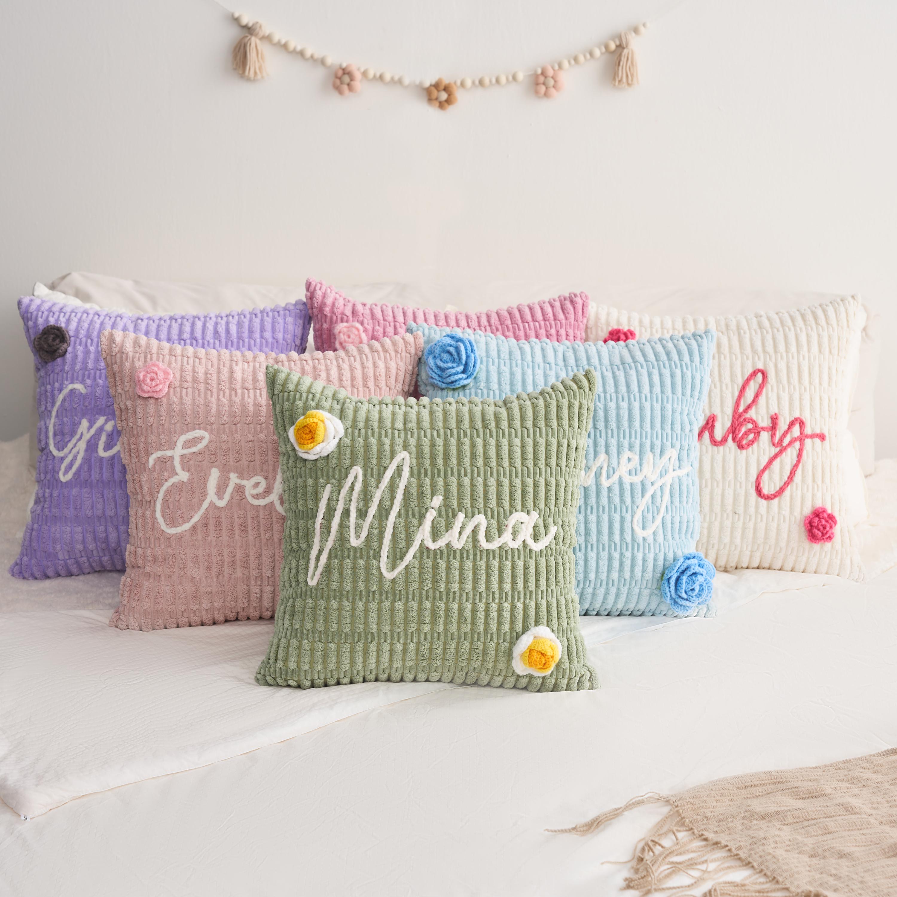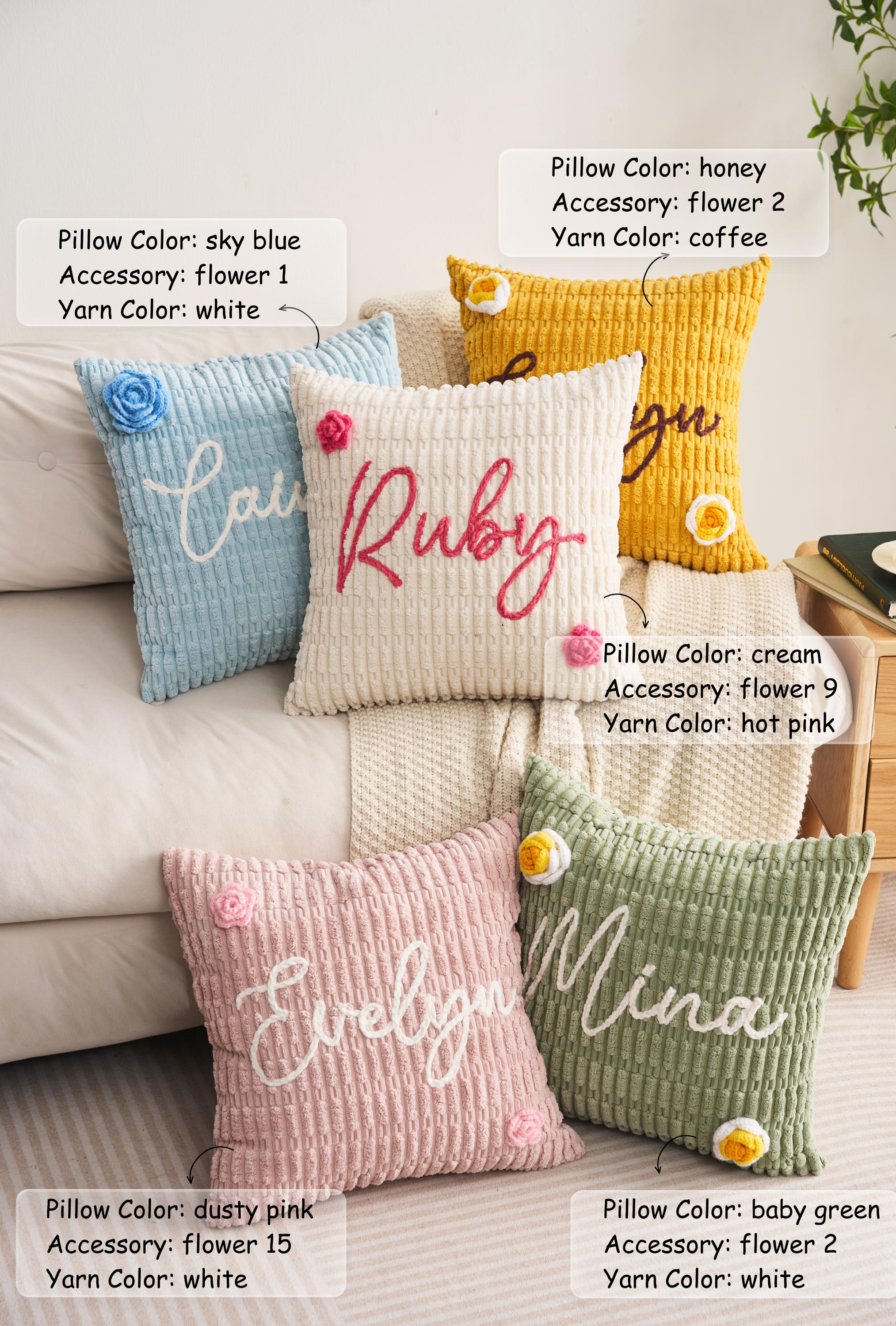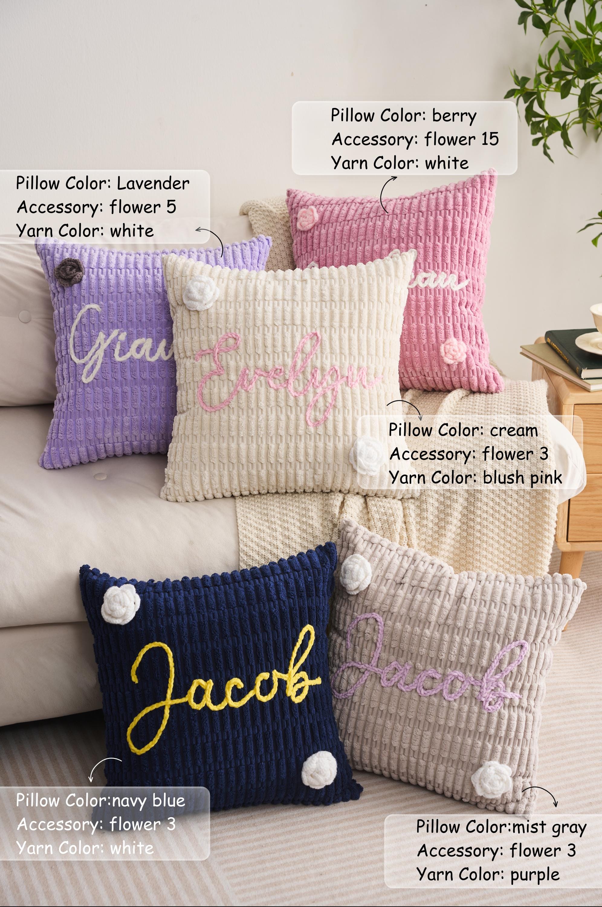 Cozy up with this soft chenille pillow, personalized with any name sewn using plush chenille thread. Choose your pillowcase color, thread color, and one of over 10 handmade flower decorations. Made with gentle, durable materials safe for the whole family.