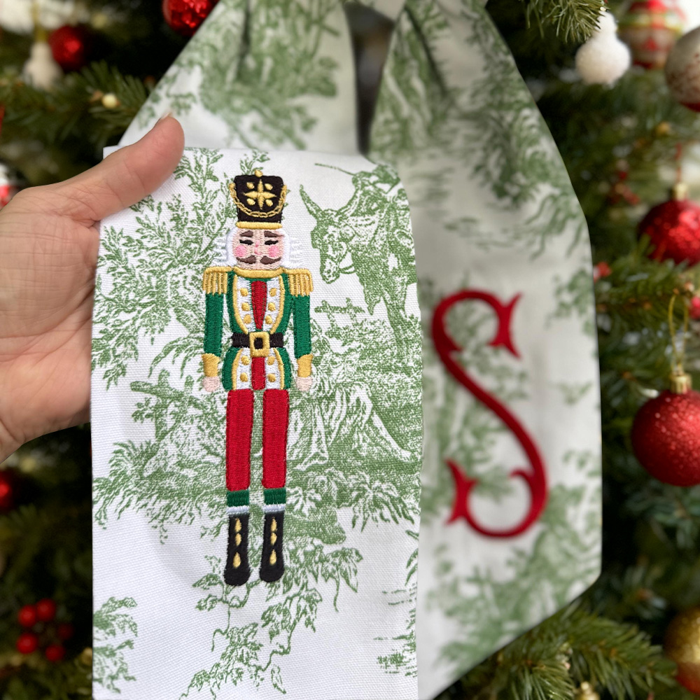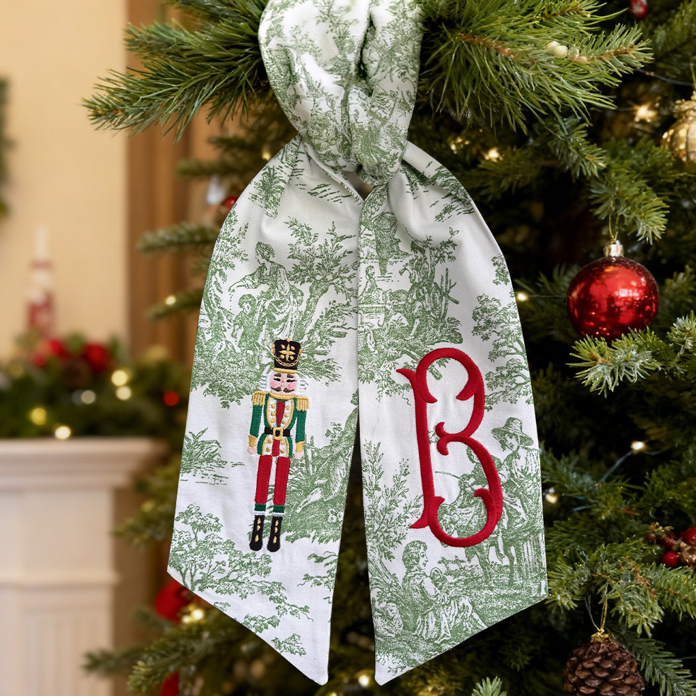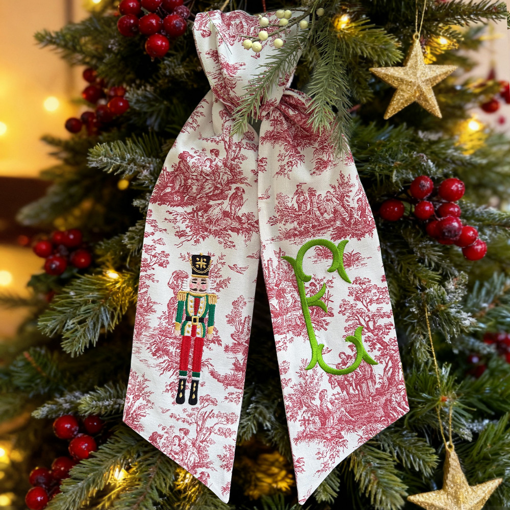 The sash comes customized to your needs with an Extra Large Red & Christmas Green Nutcracker, and your choice of monogram, one on each tail.