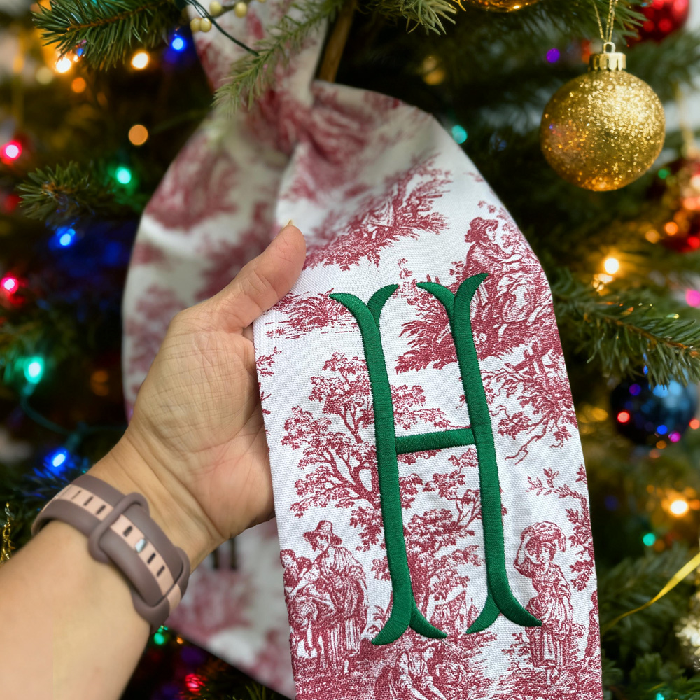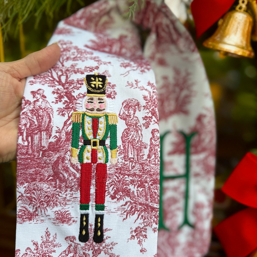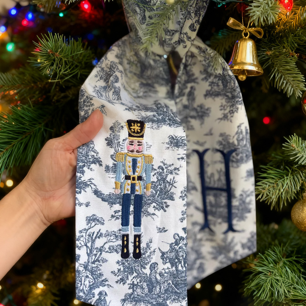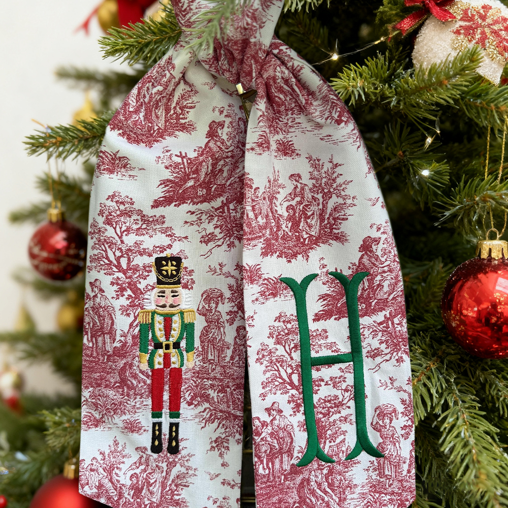 The sash comes customized to your needs with an Extra Large Red & Christmas Green Nutcracker, and your choice of monogram, one on each tail.